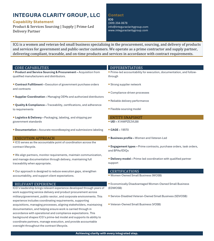 Access ICG’s current capability statement for a concise overview of direct service support, product sourcing and procurement, execution approach, relevant experience, differentiators, certifications, and business identifiers.
